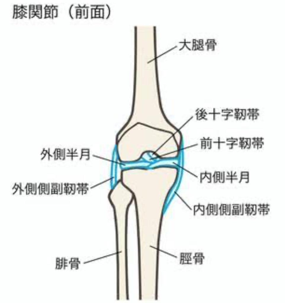 前・後十字靭帯(ぜん・こうじゅうじじんたい) 関節内包を斜行する靱帯です。前十字靭帯は、脛骨前顆を結び、下腿の過大な前方移動(伸展)を防ぎます。 後十字靭帯は、大腿骨外側顆を結び、下腿の過度な後方移動(屈曲)を防ぎます。