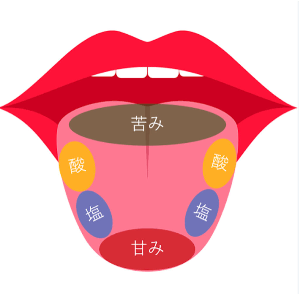 舌は場所によって感じる味が違います。甘さは舌の先、塩辛さは舌の先からやや両サイドに広がった部分、酸っぱさは舌の両サイド、苦味は舌の奥で感じます。
