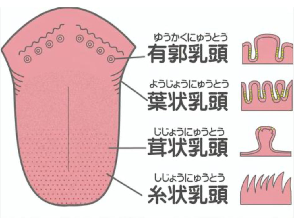有郭乳頭、耳状乳頭、葉状乳頭には味蕾という味を感じるための装置が並んでいます。