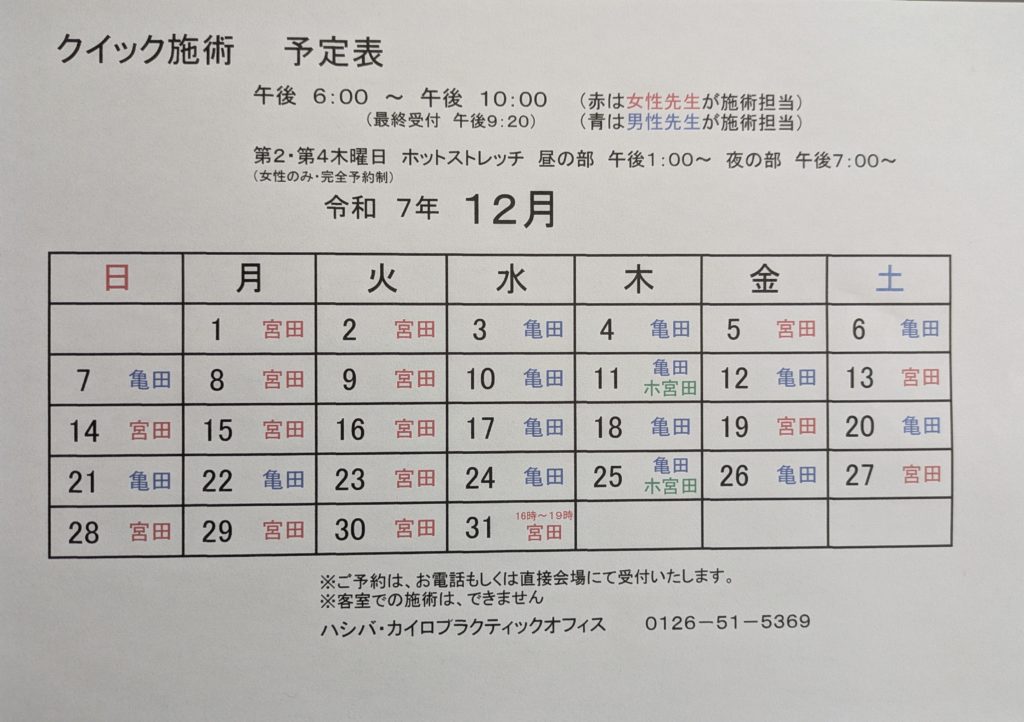 12月の北村温泉での施術予定表です 年末の大掃除や冬支度などで体が疲れてませんか?