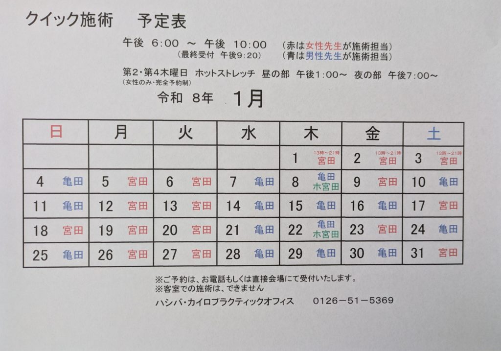 もし、「今年は体のケアを意識したいな」と思っている方は、ぜひお気軽に当オフィスへお越しください。新しい年のスタートを少しでも快適な体で迎えるお手伝いができれば嬉しいです。