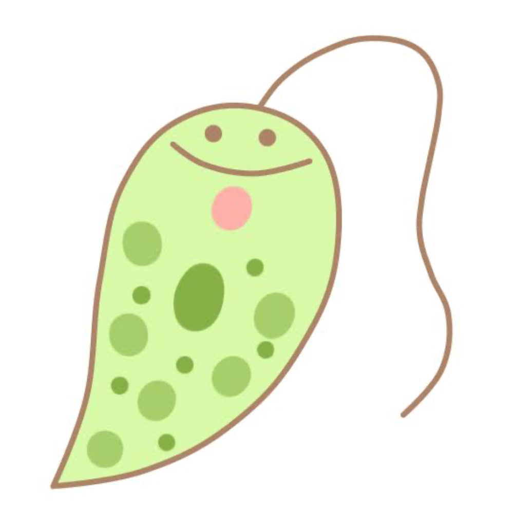 ユーグレナ、「美しい(eu)目(glena)」緑の宝石と呼ばれています。 緑色は葉緑素(クロロフィル)の色。植物のように光合成を行い、栄養分を体内に溜め、動物のように自ら泳ぎ回ることができる、地球上で唯一の植物と動物の中間生物です。植物は、光合成により二酸化炭素をデンプンに変えて細胞内へ貯蔵しますが、「ユーグレナ」は二酸化炭素を「パラミロン」という高分子多糖体に変えて細胞内に貯蔵します。