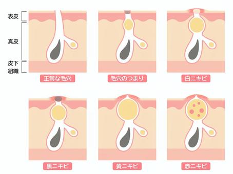炎症性・・・赤ニキビ:毛穴の奥に古い角質や皮脂などが詰まり、毛穴の中でアクネ菌が増殖し、炎症を起こした状態。 黄ニキビ:アクネ菌の増殖が進み、炎症が悪化し濃を持った状態。