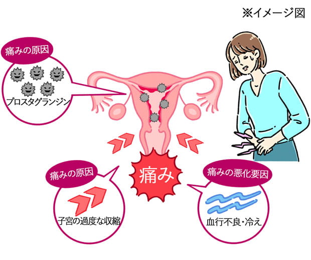 月経痛の原因は2つあります。1つは、子宮の出口にある子宮頚管(しきゅうけいかん)という部分があります。この部分が20代前半の人や、出産経験がない人は、この部分が細いことが多く、経血を無理に通過させるために痛みが生じるようです。もう1つは、「プロスタグランジン」というホルモンの過剰分泌のためです。このホルモンは、出産時に陣痛を起こすホルモンでもあり、分泌量が多くなると、子宮が収縮して痛みが生じてしまいます。