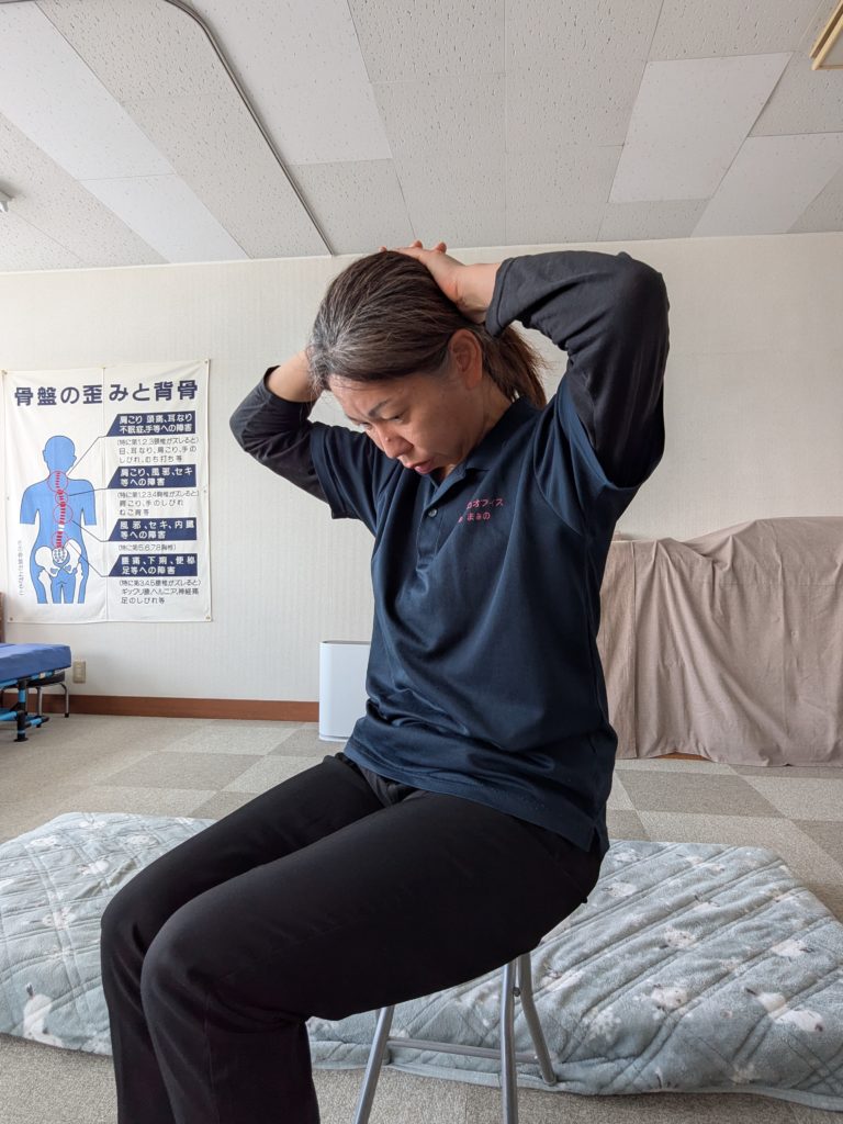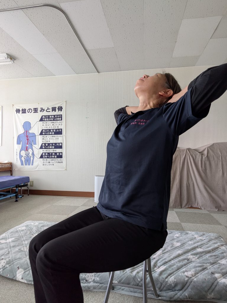 ①腰を伸ばし、まっすぐな姿勢で椅子に座ります。両手は頭の後ろに添え、体の向きと垂直になるよう、まっすぐ伸ばします。腰をまっすぐにしたまま、息を吸いながら、ゆっくりと上半身を後ろに反らします。2秒間キープ。しっかり伸ばし、目線は斜め上に向けてください。