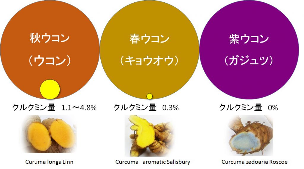 クルクミンを多く含む素材は、秋ウコン、春ウコン、ガジュツがあります。特に秋ウコンの乾燥エキスには6~8%のクルクミンが含まれています