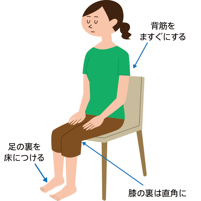 座った姿勢で 椅子に背筋を伸ばして座り、両足は床につけて肩幅に開きます。肩の力を抜いてゆっくりと肛門と膣を締めて5秒停止し、ゆっくりと力を抜きます。