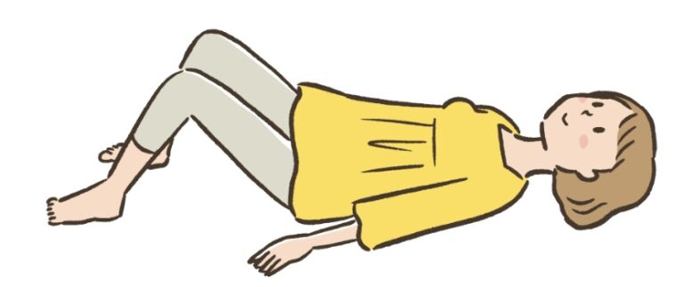 仰向けの姿勢で 脚を肩幅に開き、少し膝を立てます。お腹に手を当てるなどして腹筋に力が入らないように確認しながら、肛門と膣を締めて5秒停止し、ゆっくりと力を抜きます。
