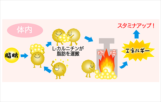 体脂肪を燃やすには、体を動かすことが必要です。体を動かと、糖質が先に使われるため、脂肪を燃やすには時間がかかりますが、カルニチンを摂っておくと、通常より短時間で脂肪が燃え始めます。激しい運動でなくても、通勤や家事など日常の動きで効率よく脂肪を燃やすことができるようになります。